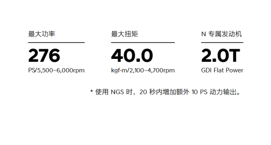 搭载N专属2.0T GDI Flat Power发动机,最大功率276PS/5500-6000rpm,峰值扭矩40.0kgf·m/2100-4700rpm,匹配8速湿式双离合变速箱,动力输出线性且狂暴。更有NGS驾趣增强模式,按下按键即可在20秒内爆发额外10PS动力,短时间爆发性能,直线加速、赛道超车都能给到极致推背感,完全是原厂“外挂”级体验。