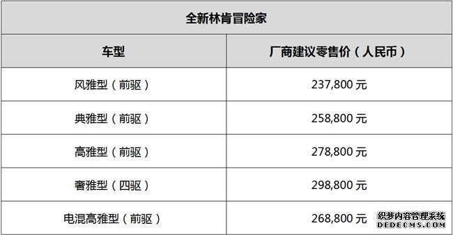 · 豪华移动堡垒——全新林肯冒险家全系车型于第十九届北京车展正式上市,新车提供风雅型、典雅型、高雅型、奢雅型、电混高雅型共五款车型,厂商建议零售价:237,800元至298,800元。