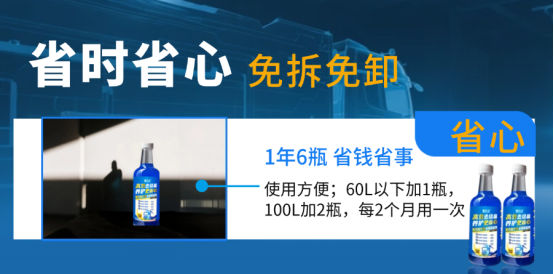 简便易用的操作:免拆卸、免安装。卡友们只需将产品按说明直接添加到尿素箱即可,无需专业技术支持,大大节省了时间和精力。定期的(建议每2个月一次)使用,即可维持SCR系统的良好状态。